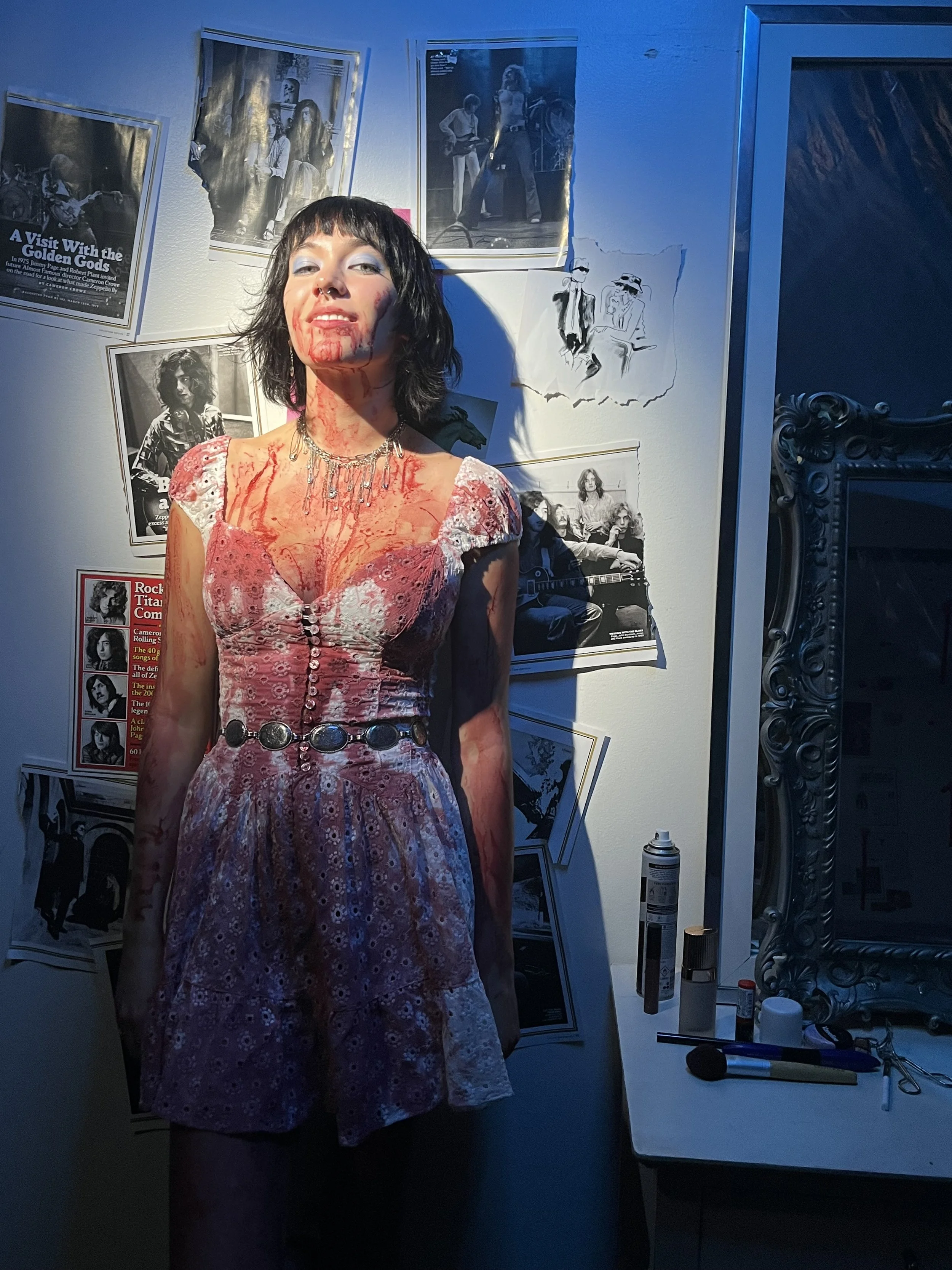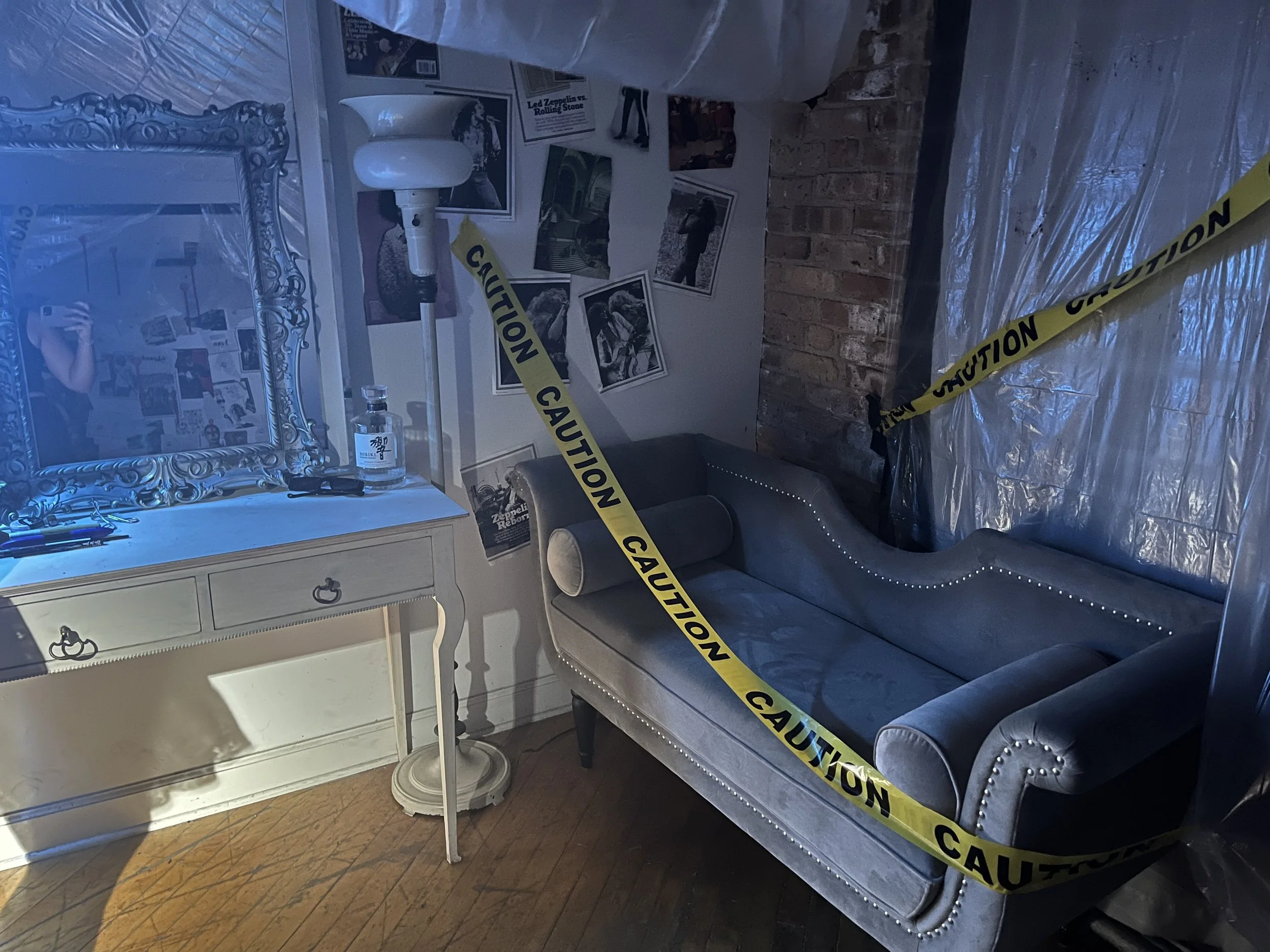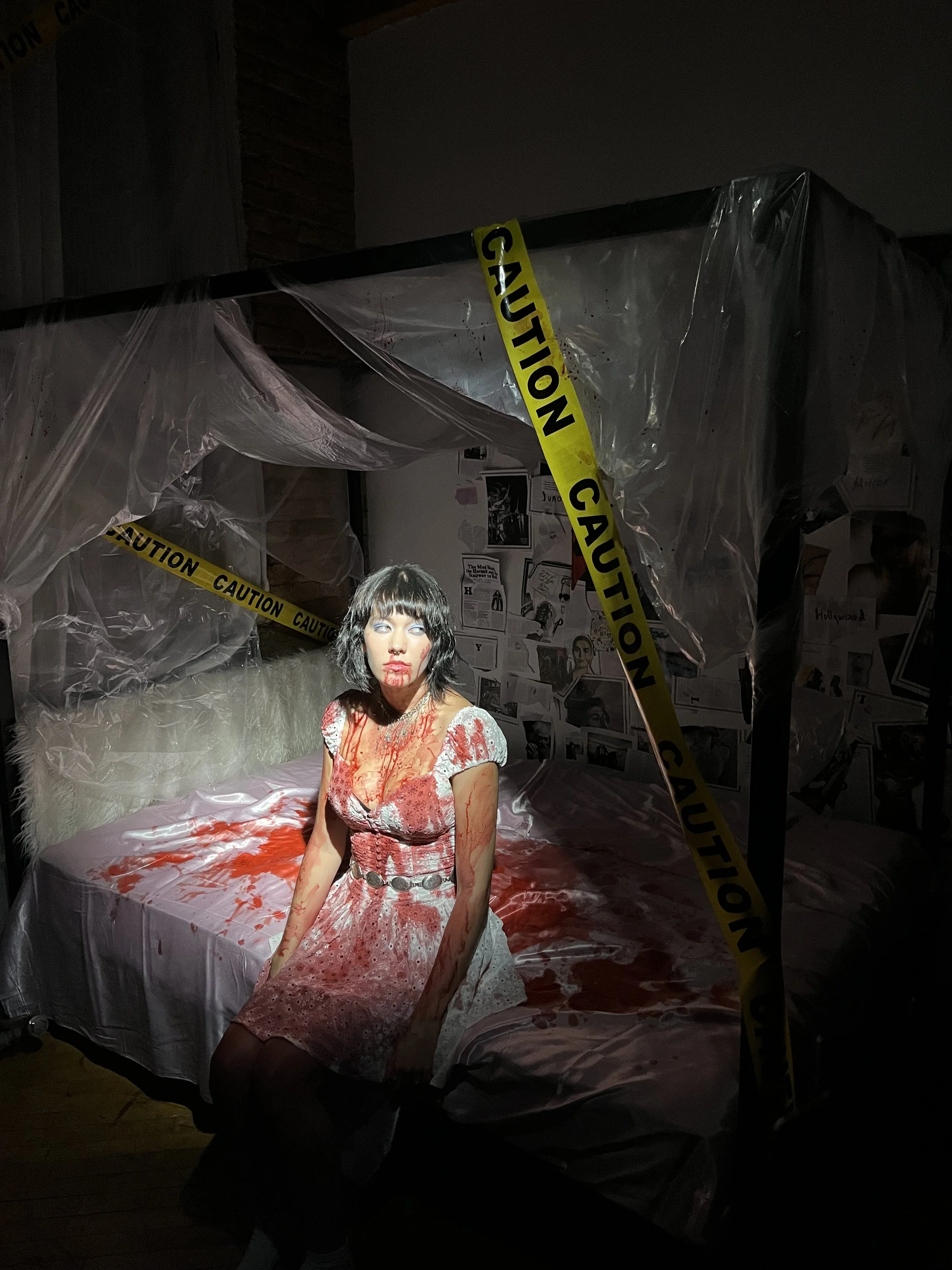 Working closely with the Production Designer, our goal was to create a crime scene where the victim was a relationship. We used collages to our advantage by pairing photos, newspapers and magazines to create a memoriam for these characters. Handling fake blood can be tricky due to its unpredictability and tendency to stain, but the creative possibilities it offers make the challenge incredibly fun and rewarding.